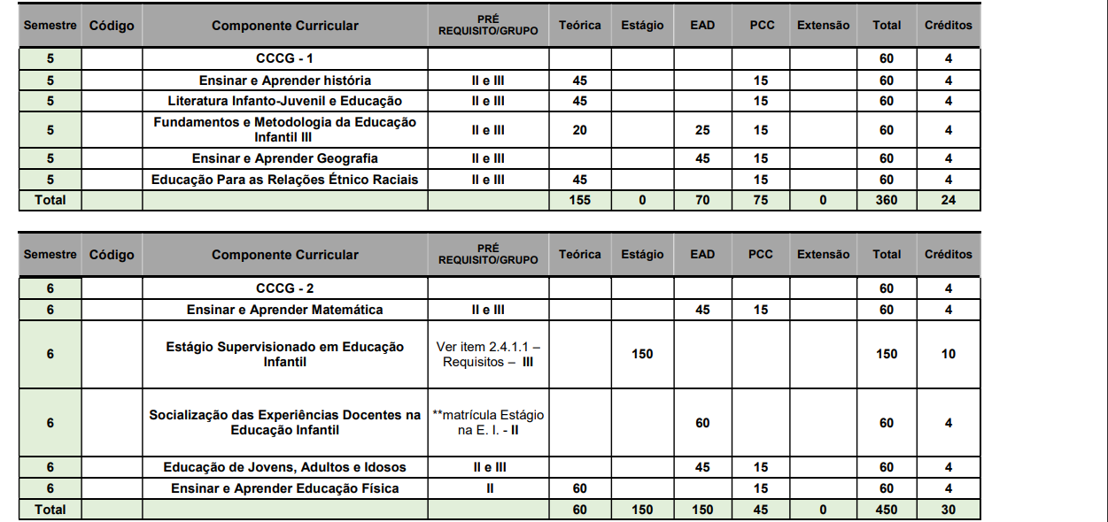 Para realização do Estágio Supervisionado em Educação Infantil – VI Semestre é necessário ter integralizado ou estar cursando os seguintes componentes: