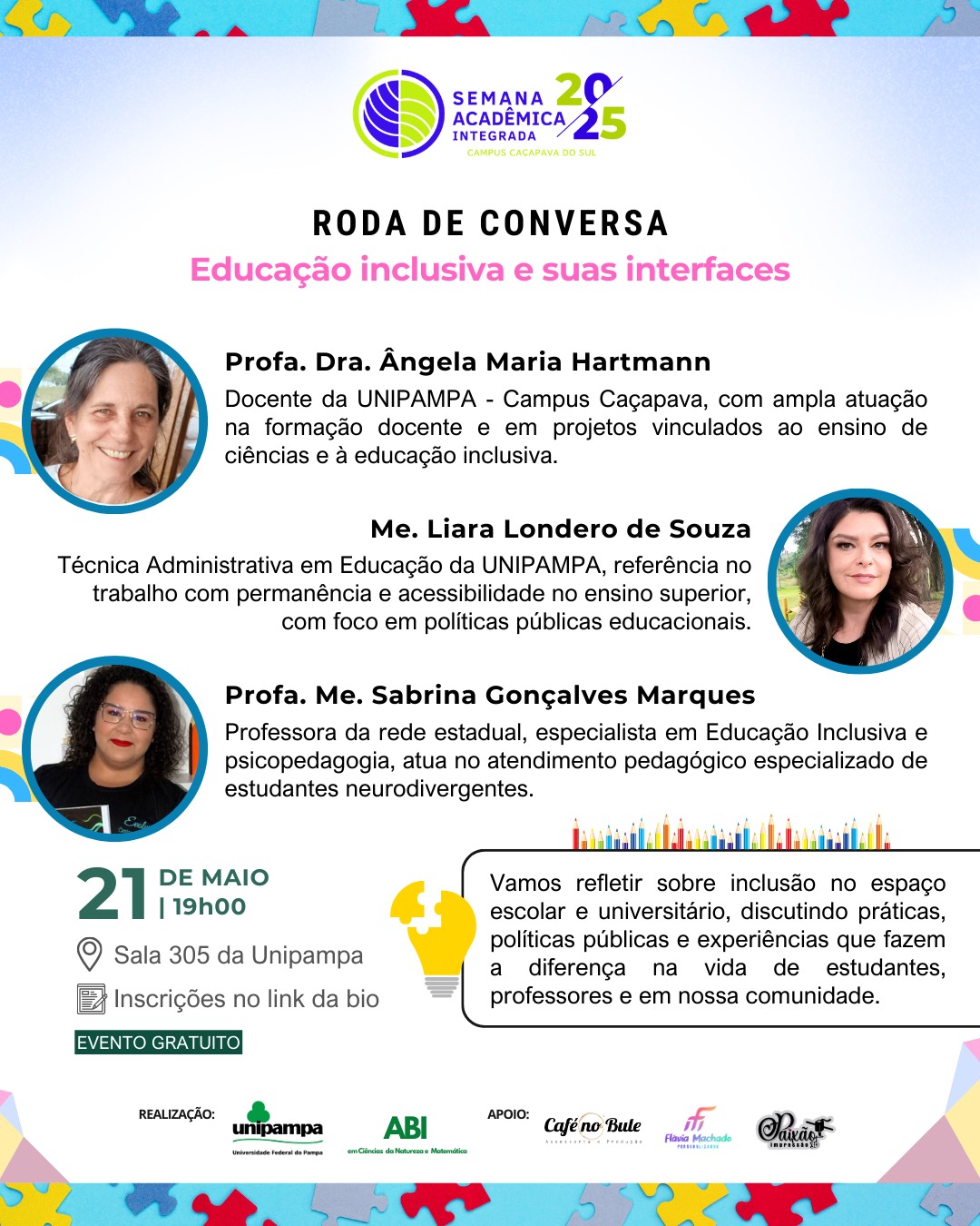 No Projeto Pedagógico do Curso (PPC) ABI – Ciências da Natureza e Matemática, o Programa Unipampa Cidadã está previsto com carga horária de 85 horas, podendo ser desenvolvido ao longo de todo o curso de graduação. A professora Jaqueline destacou, ainda, o artigo 5º da Instrução Normativa UNIPAMPA nº 18/2021, o qual reforça que as ações desenvolvidas devem atender às demandas da comunidade, proporcionar aos discentes vivências em diferentes realidades e estimular a construção de novos saberes, sentimentos e relações, ressaltando, assim, a importância do desenvolvimento de novas habilidades e da autonomia dos discentes no planejamento e execução dos projetos.