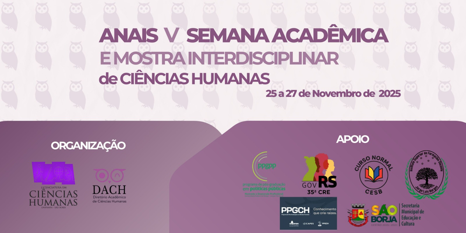 A comissão organizadora da V Semana Acadêmica e Mostra Interdisciplinar em Ciências Humanas da Unipampa, Campus São Borja informa com alegria que foram publicados o Anais do evento. Gostaríamos de agradecer a todas e todos que participaram do evento, assim como informamos que em breve serão enviados os certificados para os e-mails dos participantes.