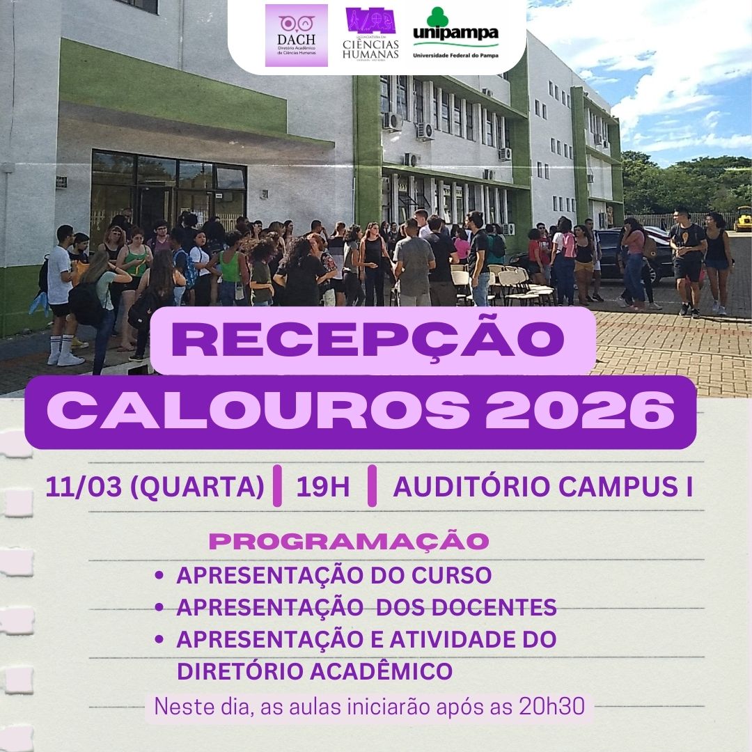 O Curso de Ciências Humanas – Licenciatura convida a comunidade do curso (Docentes, licenciandos e egressos) e comunidade externa para a aula Magna de abertura do Semestre de 2025-2, que conta com apoio do Programa de Pós-Graduação em Ciências Humanas (PPGCH-UNIPAMPA) – Mestrado Profissional.