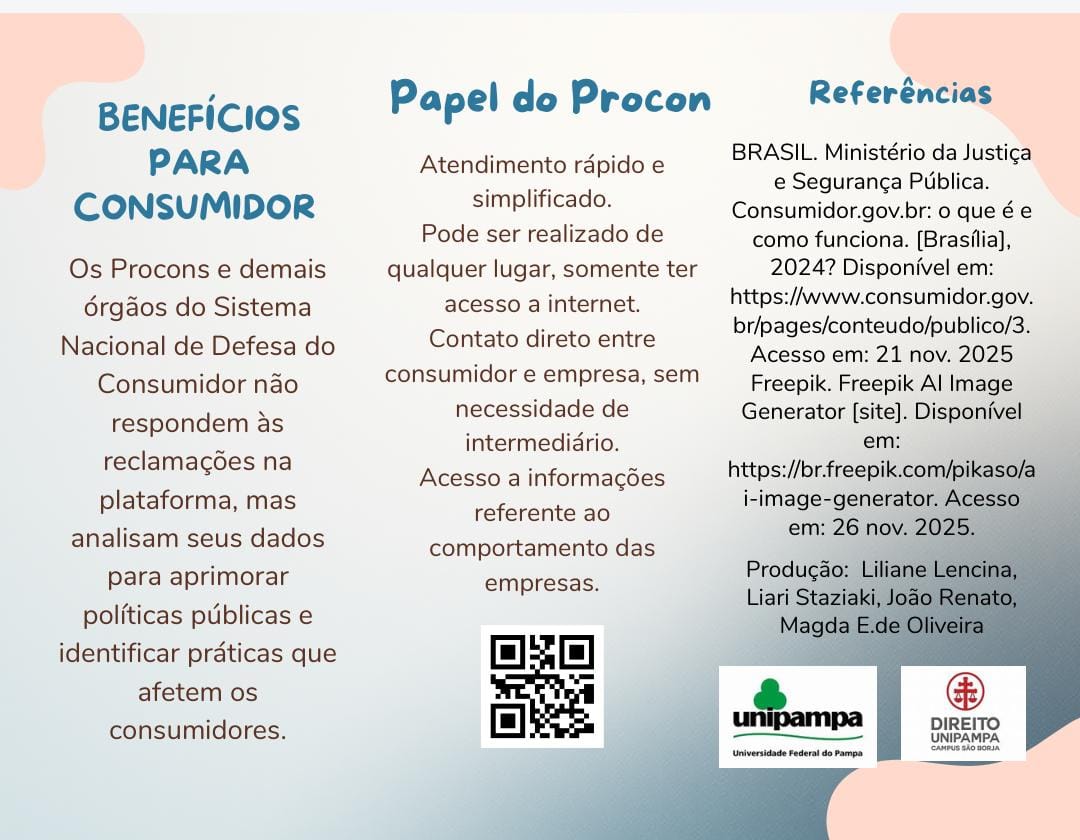 Cartilha elaborada pelos discentes do 10° semestre no componente curricular “Direito do Consumidor” sob orientação da Professora Mariluci de Matos Goncalves. O conteúdo foi elaborado pelos estudantes Magda E. de Oliveira, Liliane Lencina, Liari Staziaki e João Renato, como parte da atividade avaliativa do 10º semestre de Direito.