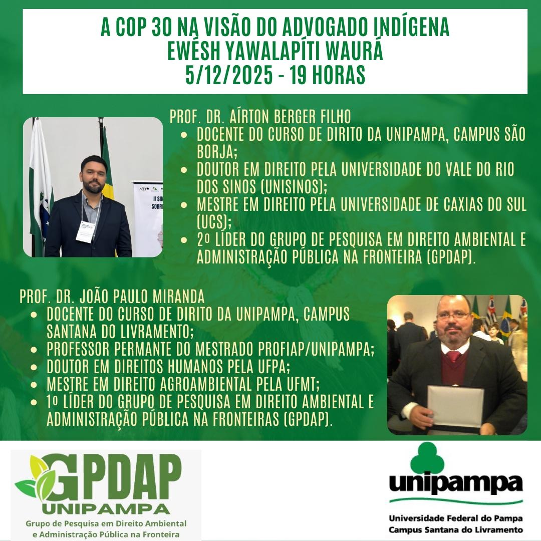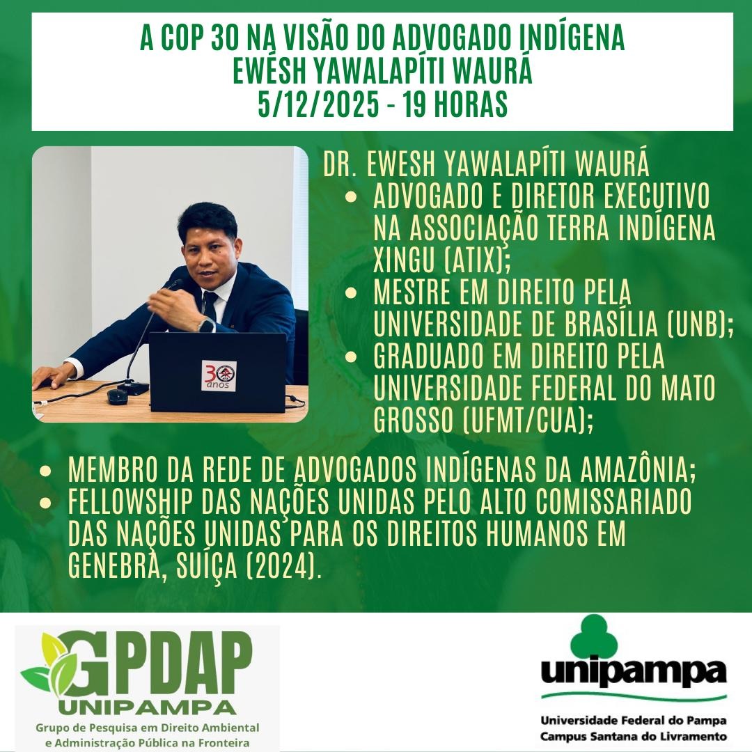 O Grupo de Pesquisa em Direito Ambiental e Administração Pública na Fronteira (GPDAP/UNIPAMPA) realizará, no dia 5 de dezembro, às 19h, a palestra “A COP 30 na visão do advogado indígena Ewêsh Yawalapíti Waurá”. O evento contará com a participação do advogado e líder indígena Ewêsh Yawalapíti Waurá, mestre em Direito pela UNB (Universidade de Brasília) e diretor executivo da ATIX (Associação Terra Indígena Xingu).