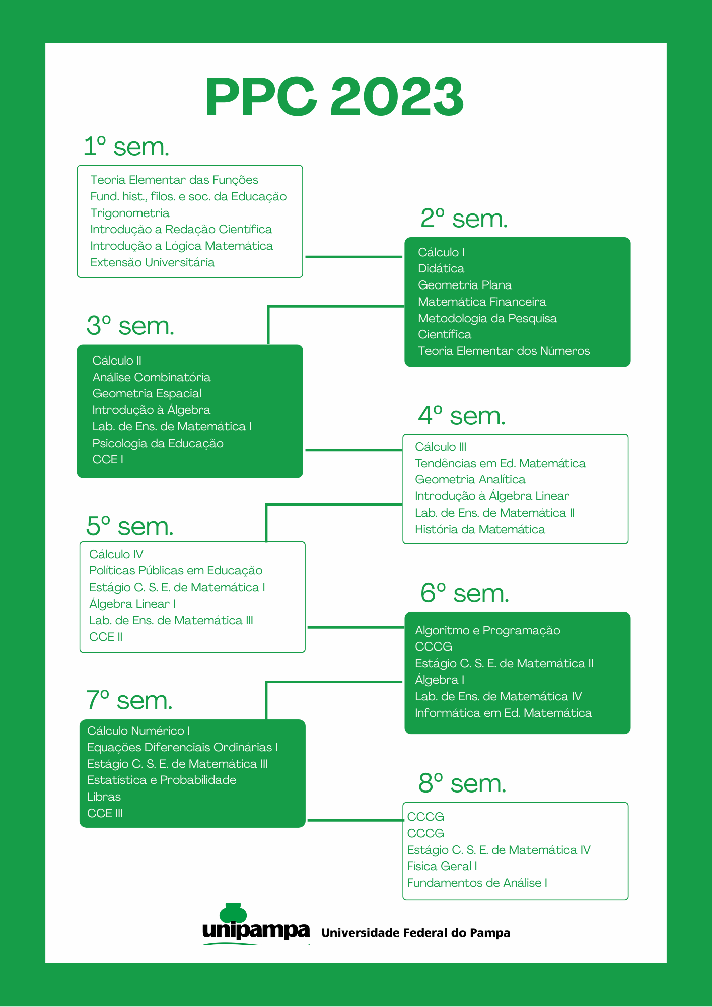 Atualmente, o curso de Matemática conta com dois Projetos Pedagógicos de Curso (PPC) em vigência. O PPC 2023, destinado aos estudantes que ingressaram a partir desse ano, e o PPC 2022, que permanece válido para os alunos que iniciaram o curso em 2022 ou em anos anteriores. Essa organização garante a continuidade dos estudos de cada turma conforme o currículo vigente no momento de sua entrada no curso.