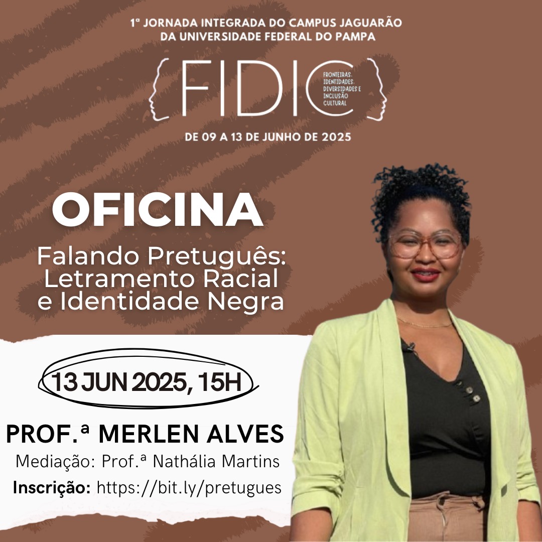 Integrando a programação da nossa Semana Acadêmica do Campus Jaguarão (FIDIC – Fronteiras, Identidades, Diversidade e Inclusão Cultural), convidamos toda a comunidade acadêmica para participar da oficina “Falando Pretuguês: Letramento Racial e Identidade Negra”, com a Prof.ª Merlen Alves.