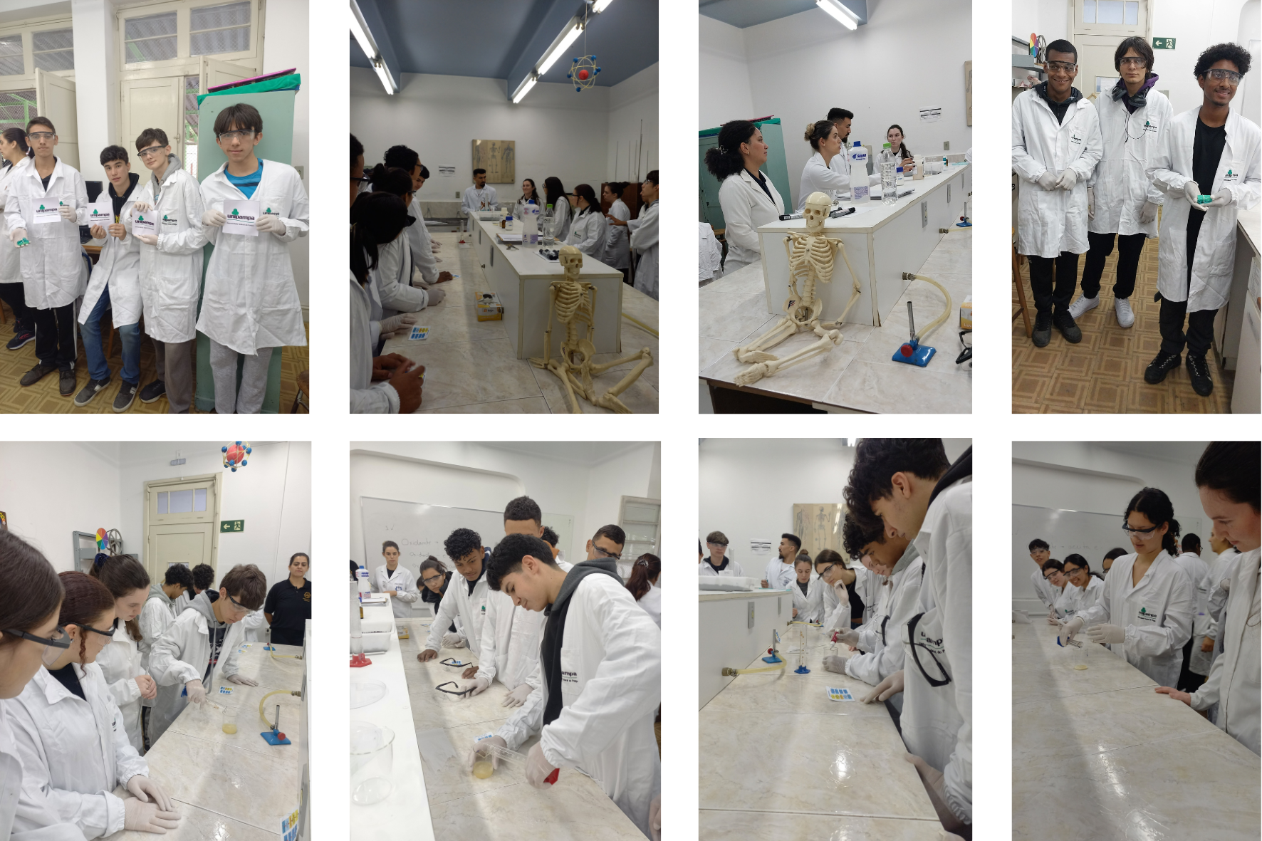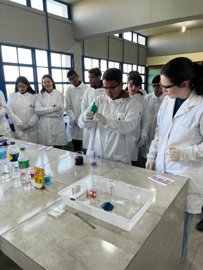 Durante a ação, os estudantes do ensino médio puderam conhecer e utilizar o Autolab, um carrinho de reagentes equipado para a realização de experimentos práticos. Com o apoio de vidrarias e materiais do próprio laboratório escolar, foram executados dois experimentos presentes no manual do Autolab: a Lava Efervescente, que demonstra princípios de reação química e formação de gás, e a Mágica das Cores, que explora mudanças de cor e conceitos de indicadores.