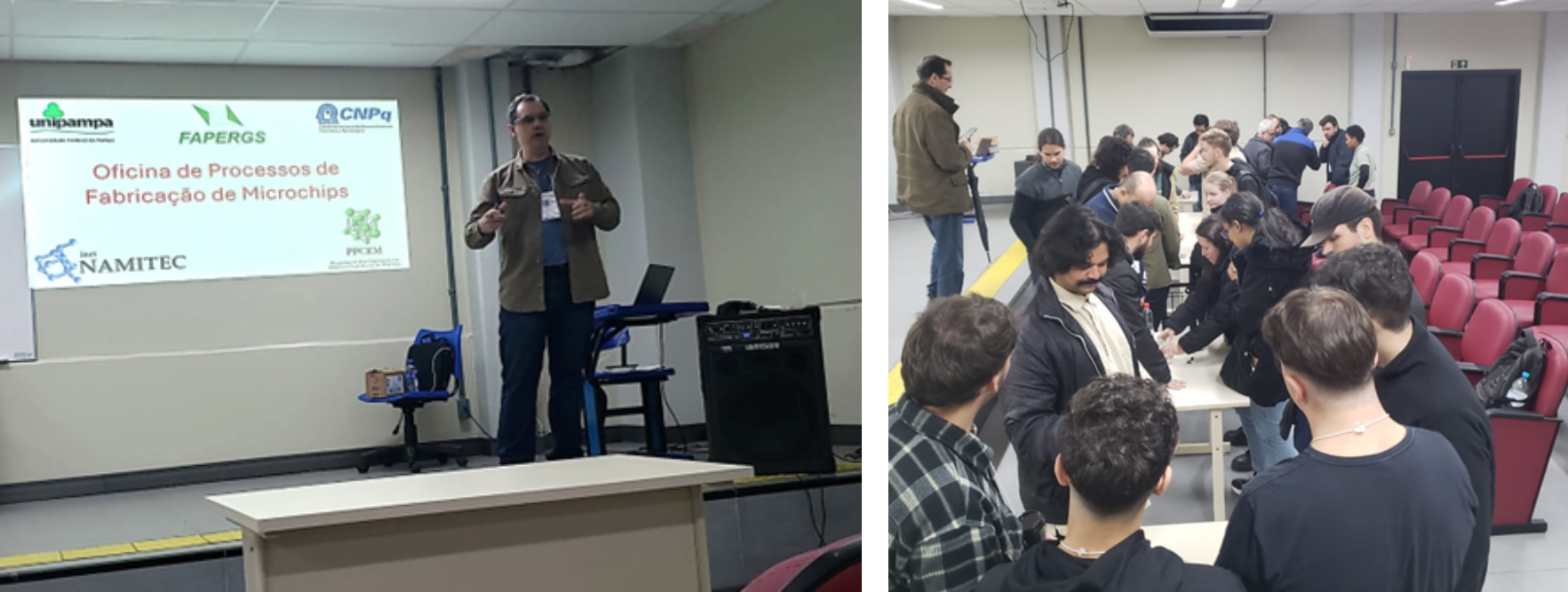 No dia 22 de novembro, durante os períodos da manhã e tarde, os estudantes Lucas Paiva e Vanessa Castro de Oliveira, dos cursos de graduação e pós-graduação da Universidade Federal do Pampa (UNIPAMPA), ministraram atividades práticas sob a orientação dos professores Dr. Eduardo Ceretta Moreira e Dr. Gabriel Henrique Justi. A ação aconteceu nos laboratórios 1106 e 1207, onde os participantes tiveram a oportunidade de conhecer processos relacionados à fabricação de microchips e explorar uma introdução ao uso do Arduíno.