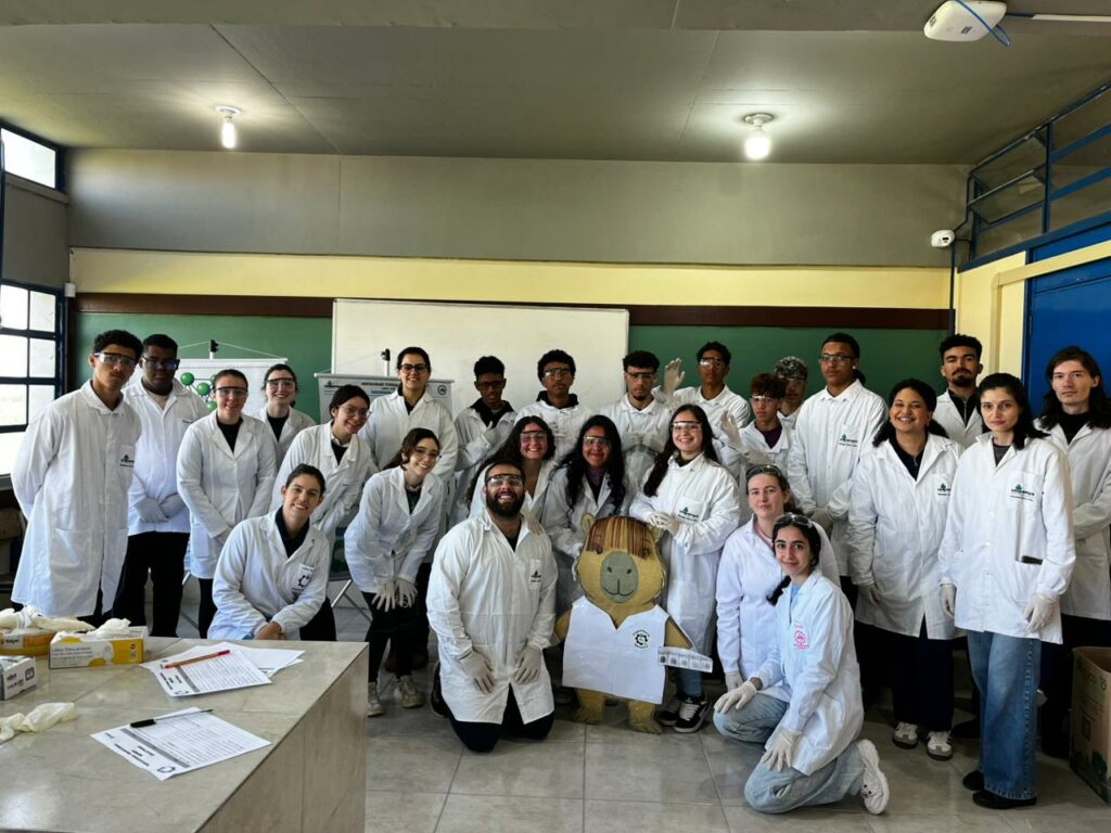 Na ocasião, foram conduzidas oficinas com as turmas do 1º e do 2º ano, nas quais os alunos participaram de um experimento de extração do DNA do morango.