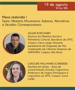 No dia 19 de agosto, a mesa “Memória Missioneira: Saberes, Narrativas e Desafios Contemporâneos” trará discussões sobre a construção da memória coletiva e os registros históricos e culturais das comunidades locais. Entre os destaques, está a participação da Prof.ª Dra. Juliani Borchardt da Silva, professora permanente do Programa de Pós-Graduação em Ciências Humanas (PPGCH/Unipampa) e doutora em Memória Social e Patrimônio Cultural, além de Caroline Mallmann Schneiders, doutora em Letras e professora da UFFS.