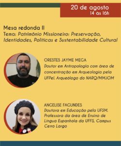 Já no dia 20 de agosto, a mesa “Patrimônio Missioneiro: Preservação, Identidades, Políticas e Sustentabilidade Cultural” abordará os desafios da preservação do patrimônio material e imaterial. As falas ficarão a cargo de Orestes Jayme Mega, arqueólogo do Núcleo de Arqueologia de Santo Ângelo, e Angelise Fagundes, professora da área de Ensino de Língua Espanhola da UFFS.