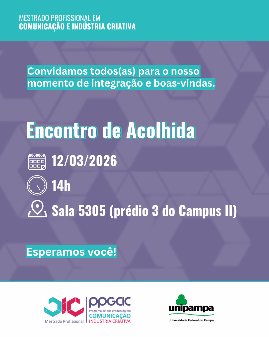 O Programa de Pós-Graduação em Comunicação e Indústria Criativa (PPGCIC) realizará, no dia 12 de março de 2026, um Encontro de Acolhida voltado a discentes e docentes do programa. A atividade acontece às 14h, na sala 5305.