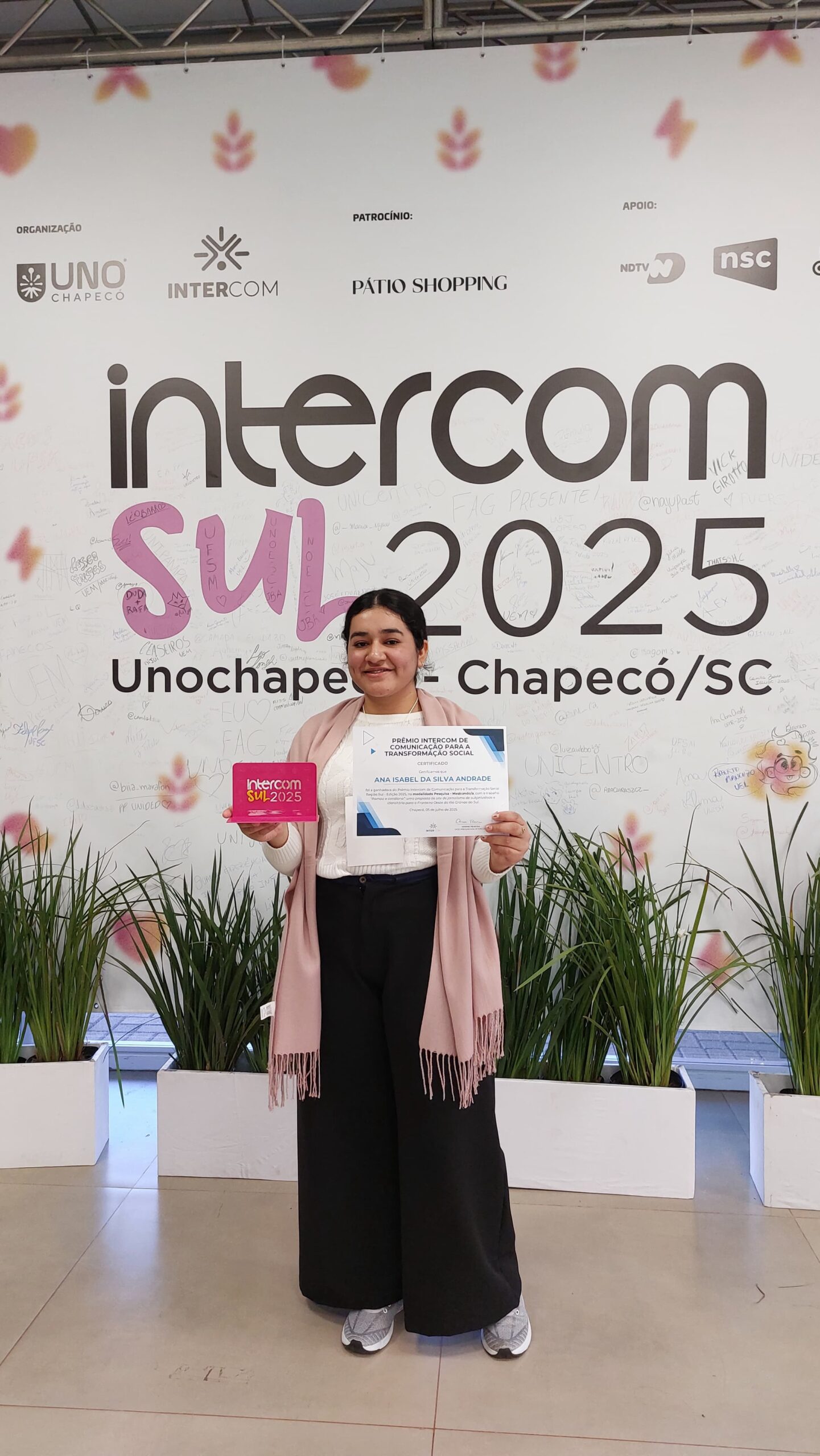 A mestranda Ana Isabel da Silva Andrade foi premiada na modalidade Pesquisa – mestrando/a, no Prêmio Intercom de Comunicação para a Transformação Social, que tem como objetivo reconhecer trabalhos de pesquisa, ensino e extensão que geram impacto social positivo na sociedade, a partir da Comunicação. Seu projeto de Pesquisa, Desenvolvimento e Inovação (PD&I), desenvolvido dentro do PPGCIC em 2024, intitulado “Pampa e cotidiano – uma proposta de site jornalístico de subjetividade e identidade para a Fronteira Oeste do Rio Grande do Sul”, foi apresentado no Grupo de Trabalho “Comunicação, Cultura e Sociedade”, na sexta-feira (04), e se destacou entre os trabalhos da categoria.