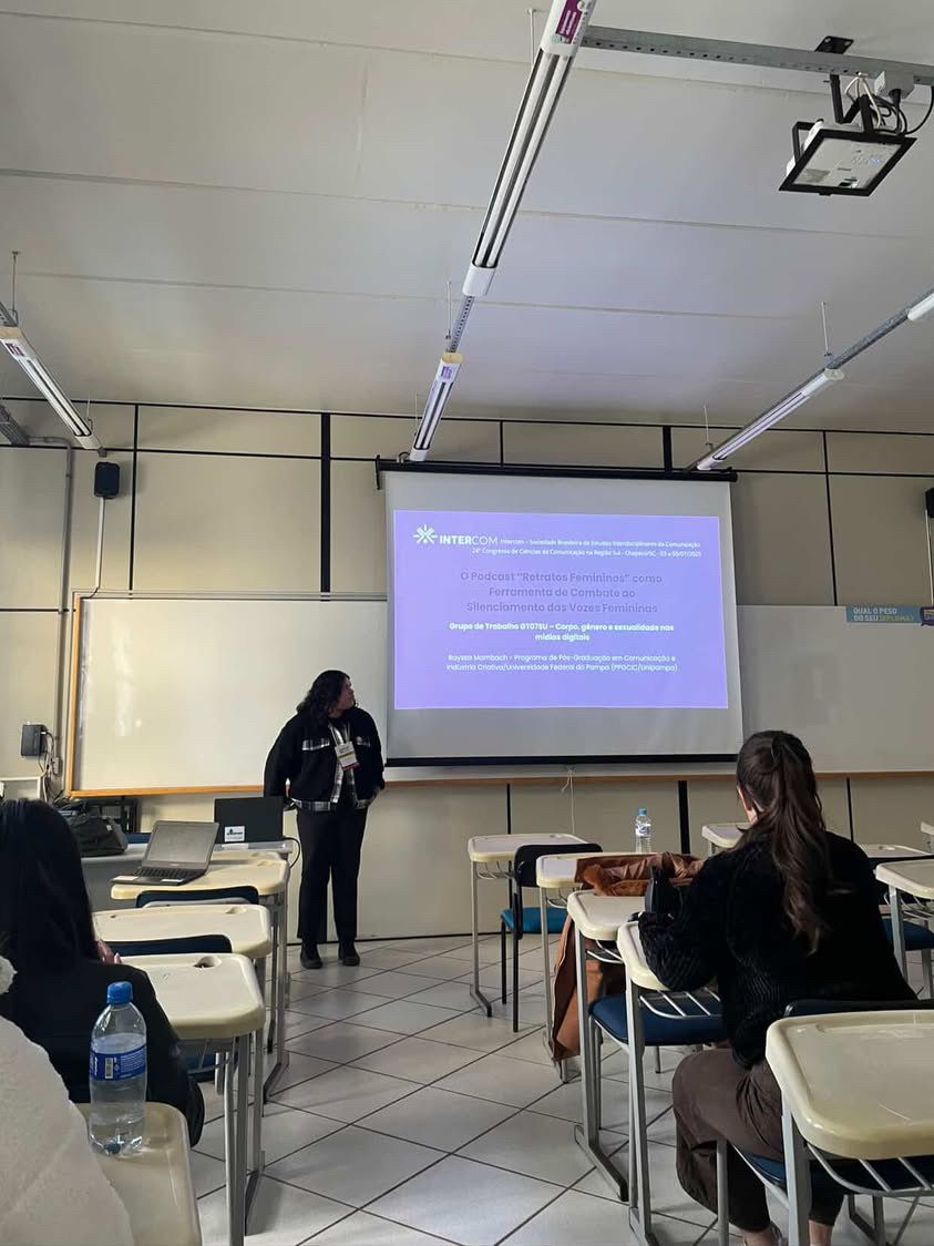 Além dos premiados, outros dois integrantes do programa também apresentaram suas pesquisas no congresso. A mestranda Rayssa Mambach participou do Grupo de Trabalho “Corpo, Gênero e Sexualidade nas Mídias Digitais”, com a pesquisa “O podcast ‘Retratos Femininos’ como ferramenta de combate ao silenciamento das vozes femininas”, parte de seu projeto de PD&I executado em 2024, e que foi orientado pelas docentes Alciane Nolibos Baccin e Luciana Menezes Carvalho. No trabalho, Rayssa discute o podcast como uma plataforma de amplificação das vozes femininas e de enfrentamento às desigualdades de gênero.