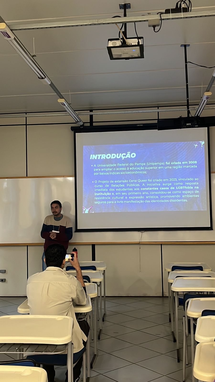 Já o pós-graduando Antônio Kanaan Fassbinder, que também está concluindo o curso de Relações Públicas, em parceria com o acadêmico Victor Matheus Salcedo, recebeu o Prêmio Intercom de Comunicação para a Transformação Social – Região Sul, na modalidade Pesquisa – Graduando/a, com o trabalho “Cena queer: a extensão universitária na busca pela identidade da comunidade LGBTQIAPN+ no interior do Rio Grande do Sul”. O Cena Queer é uma iniciativa que promove ações culturais voltadas à visibilidade da comunidade LGBTQIAPN+ da UNIPAMPA e do município de São Borja, fortalecendo espaços de expressão, pertencimento e inclusão por meio da arte e da comunicação. De acordo com Antônio, a conquista valida o esforço de meses de trabalho e representa uma oportunidade de levar o projeto além dos limites de São Borja e do Rio Grande do Sul: “Para mim, foi muito satisfatório tornar o projeto conhecido por outros pesquisadores da área e comunicadores. Esse prêmio reforça a importância da criação de espaços e políticas públicas para pessoas da comunidade LGBTQIAPN+, além do desenvolvimento de eventos que quebram a rotina universitária, que muitas vezes é estressante e desgastante”, afirmou o mestrando.