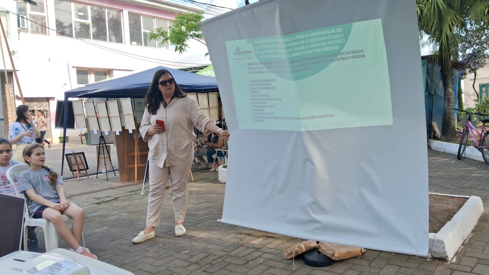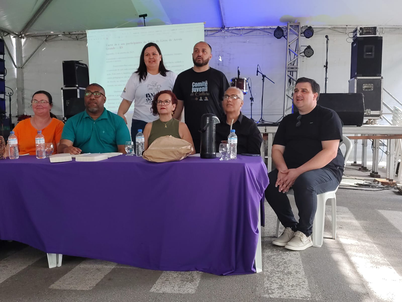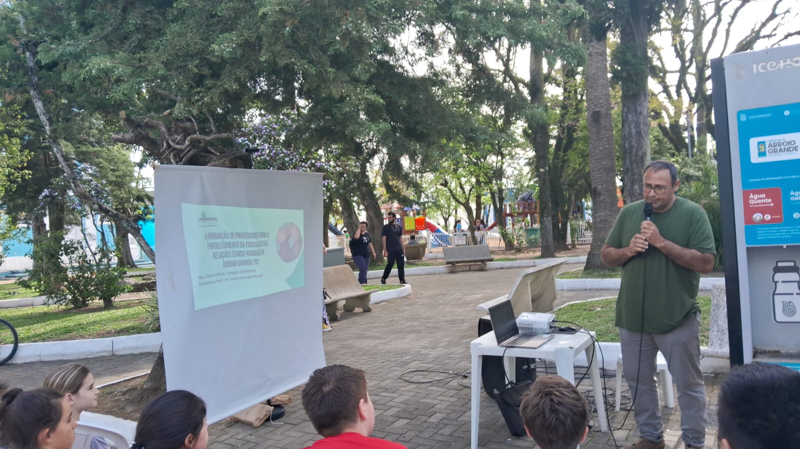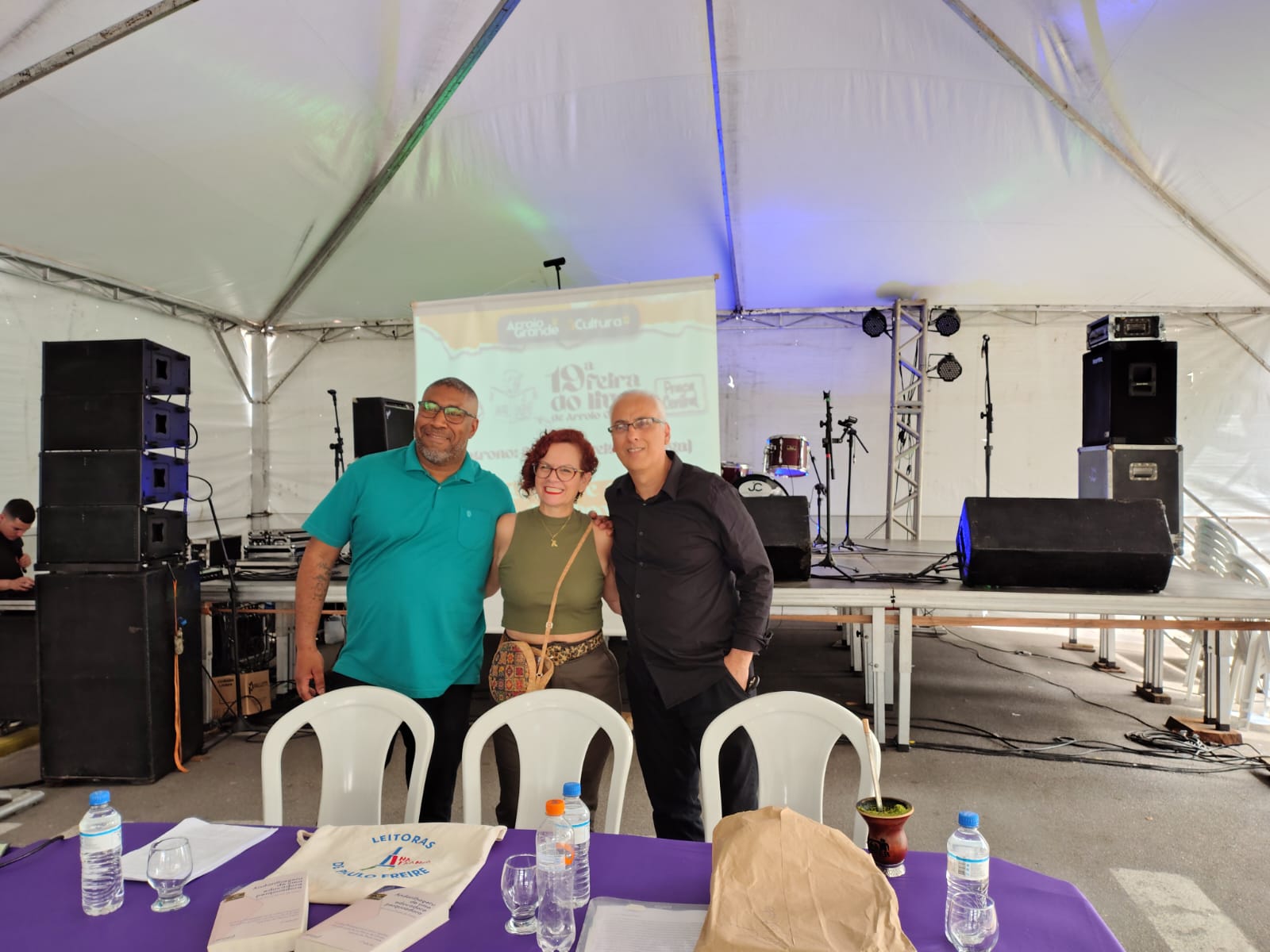 Nos dias 10 e 11 de outubro de 2025, docentes, discentes e egressos do PPGEdu participaram da Feira do Livro de Arroio Grande, divulgando suas pesquisas através de rodas de conversa. No dia 10 de outubro, a professora Dr.ª Juliana Brandão Machado organizou a roda de conversa “Políticas para a ERER em Arroio Grande: pesquisas e perspectivas”, que teve a participação do aluno egresso Carlos Olívio Salaberry e da egressa do Curso de Pedagogia, professora Liziane Pereira Lima. No dia 11 de outubro, a professora Dr.ª Ana Cristina da Silva Rodrigues organizou e mediou a roda de diálogo sobre “Cartas Pedagógicas”, que contou com a presença do discente egresso Tiago Ramires e do aluno José Eduardo Martins Carvalho. O PPGEdu também contou com uma aluna na organização da Feira, a Tuania Martins Nunes. O objetivo da participação do programa foi compartilhar conhecimentos científicos produzidos nas pesquisas do curso de Mestrado Profissional em Educação. Foram duas tardes muito frutíferas junto à comunidade de Arroio Grande.