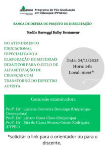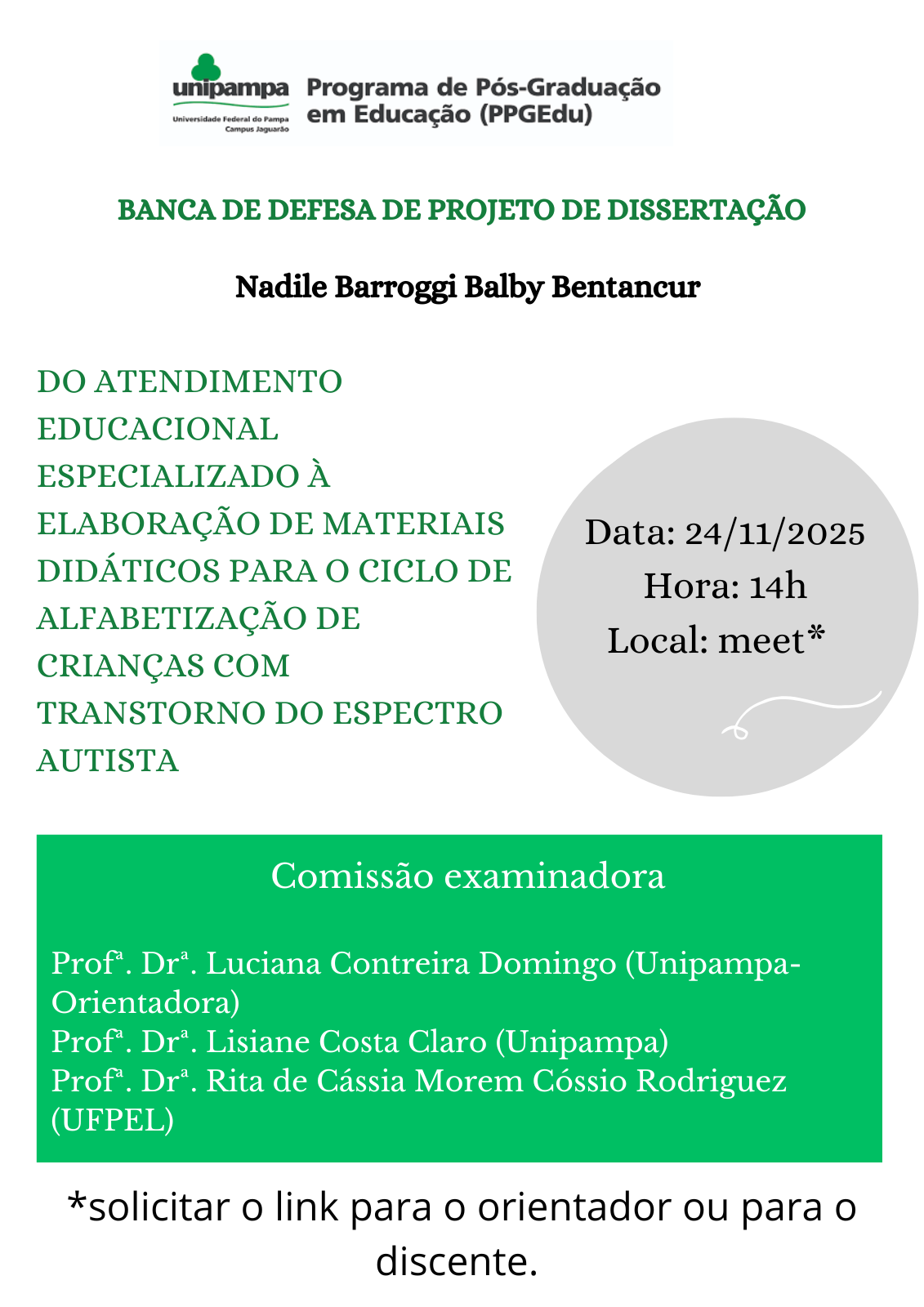 O Programa de Pós-Graduação em Educação da Unipampa convida para a defesa do projeto de dissertação de Nadile Barroggi Balby Bentancur, intitulado “Do Atendimento Educacional Especializado à Elaboração de Materiais Didáticos para o Ciclo de Alfabetização de Crianças com Transtorno do Espectro Autista”.