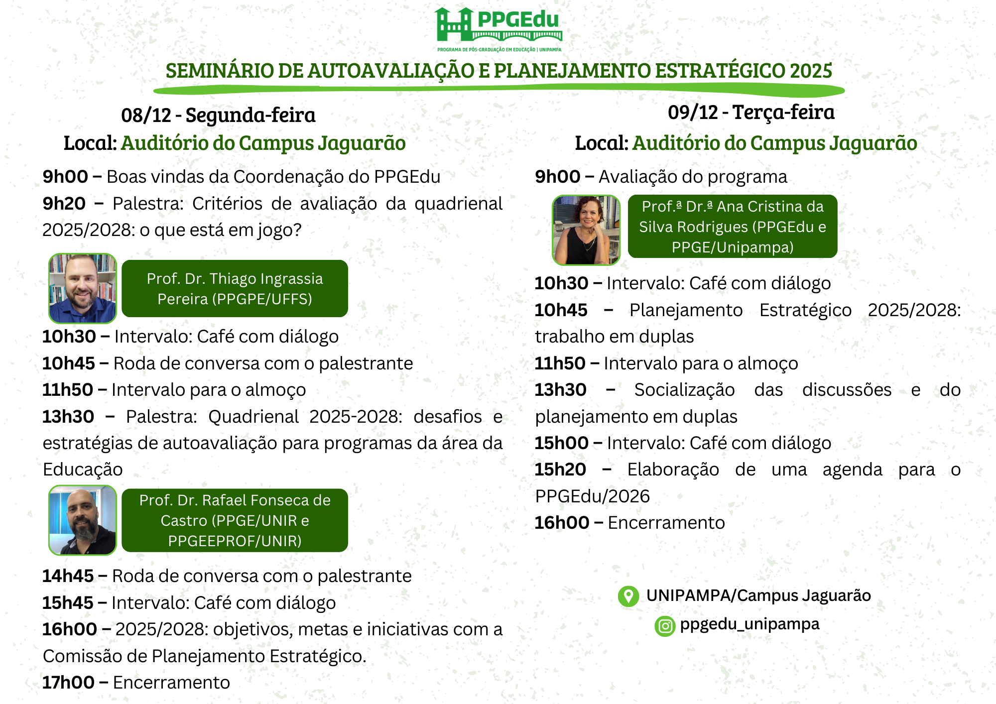 Nos dias 08 e 09 de dezembro, no Auditório da UNIPAMPA/Campus Jaguarão, acontecem duas manhãs e tardes de diálogos, palestras e construção coletiva sobre avaliação, metas e estratégias.