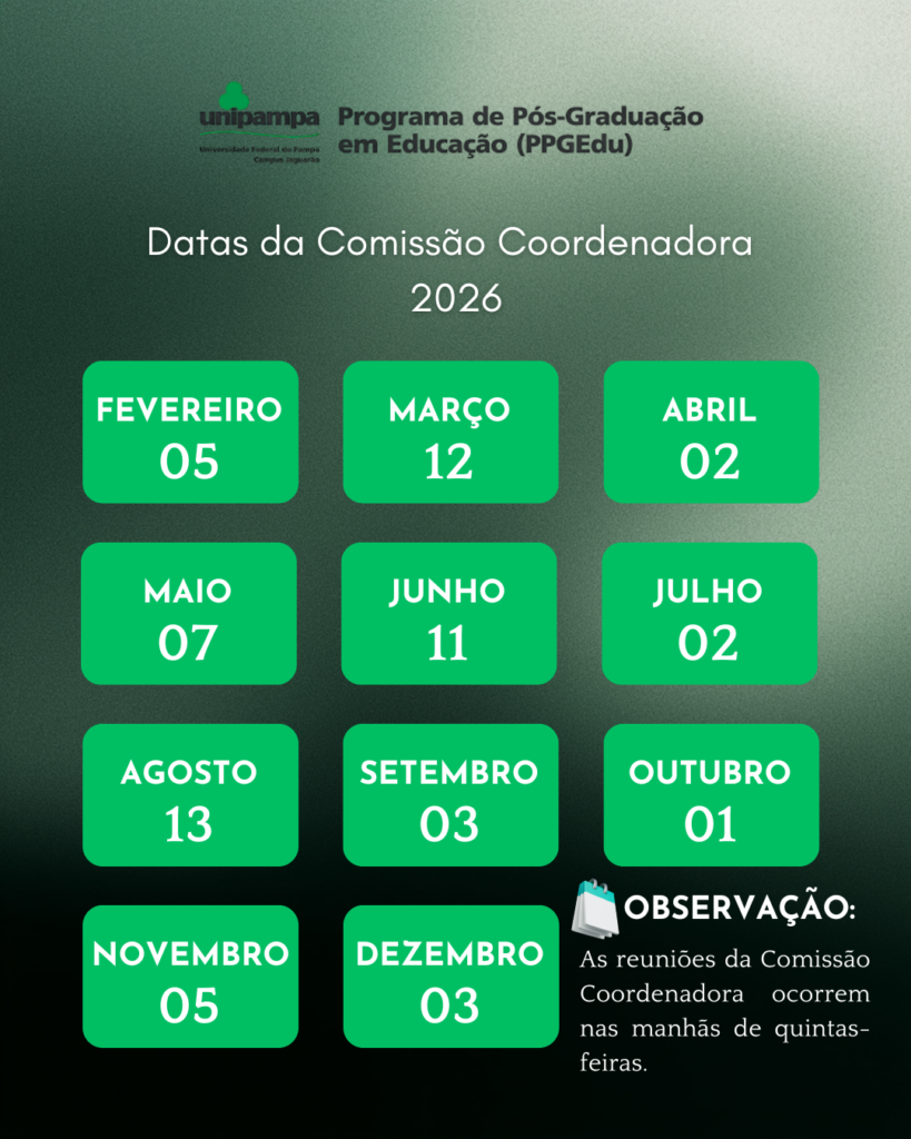 Confira o cronograma de reuniões da Comissão Coordenadora do Programa de Pós-Graduação em Educação (PPGEdu/Unipampa) para o ano de 2026.