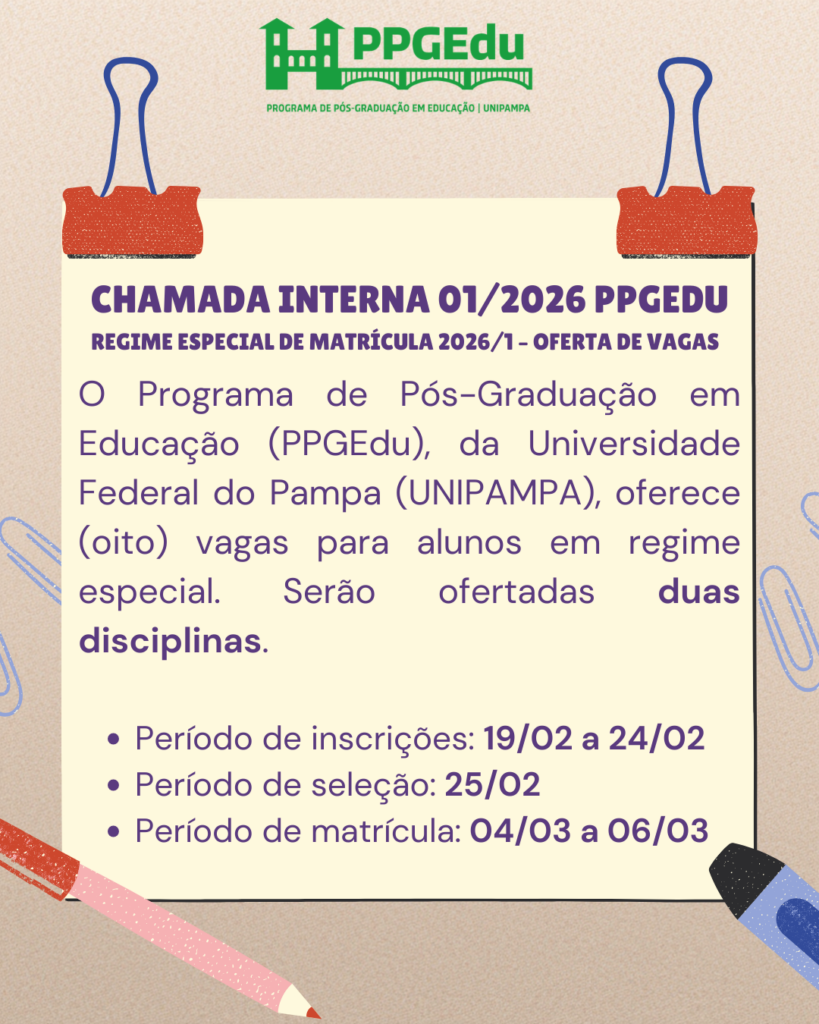 O Programa de Pós-Graduação em Educação (PPGEdu/UNIPAMPA) torna pública a Chamada Interna 01/2026 para matrícula em Regime Especial no semestre 2026/1.