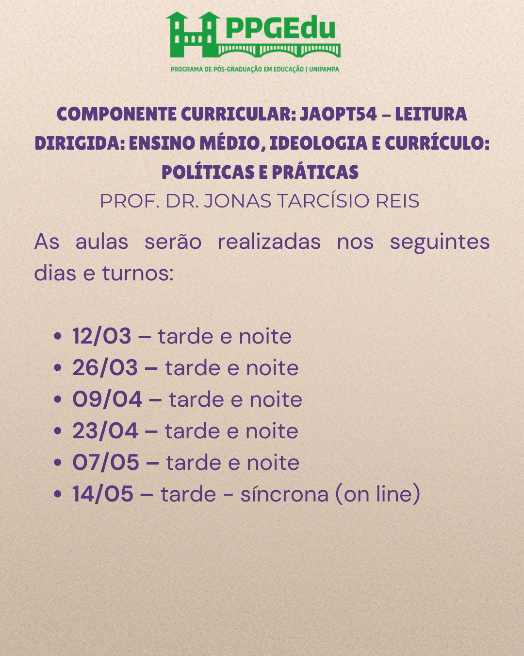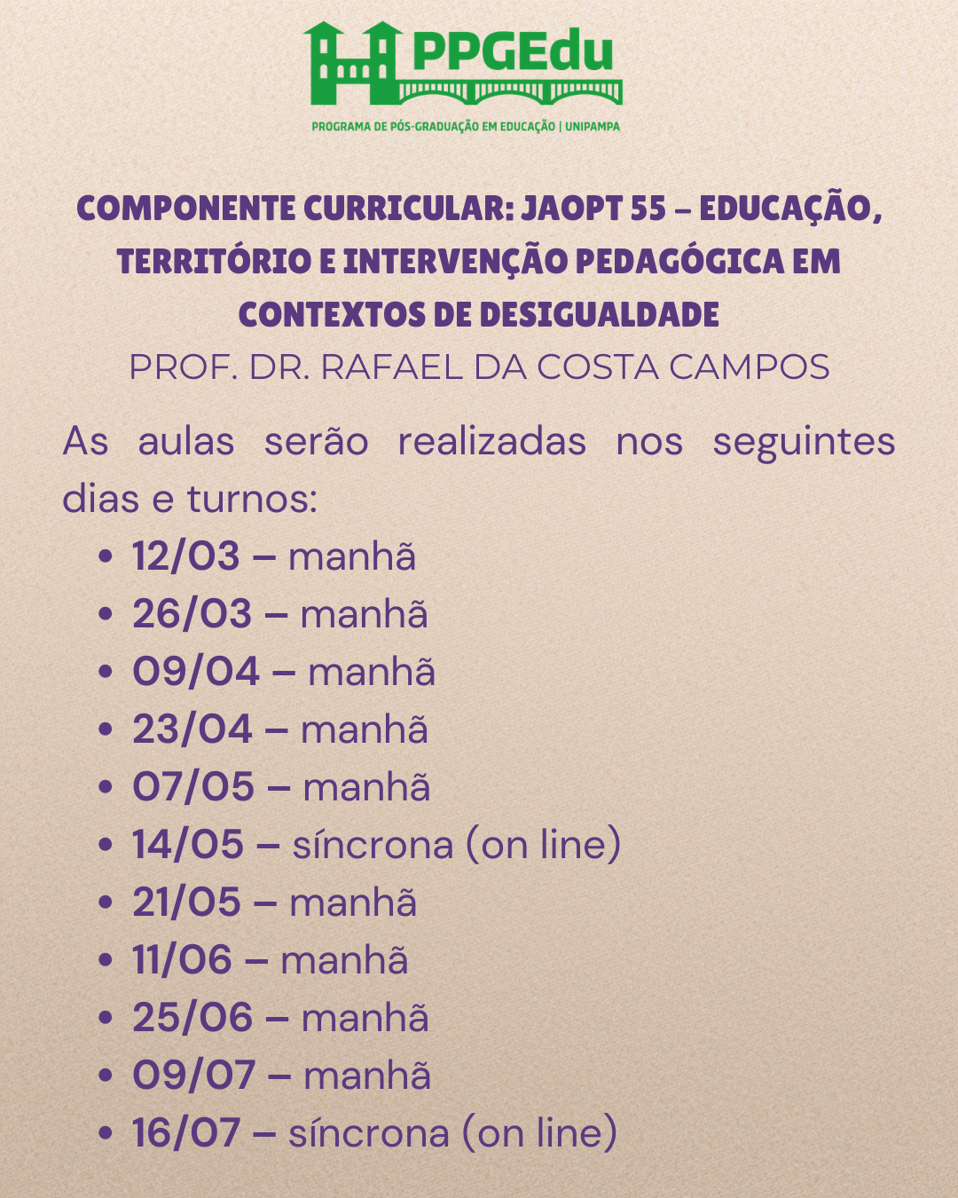 O Programa de Pós-Graduação em Educação (PPGEdu/UNIPAMPA) torna pública a Chamada Interna 01/2026 para matrícula em Regime Especial no semestre 2026/1.