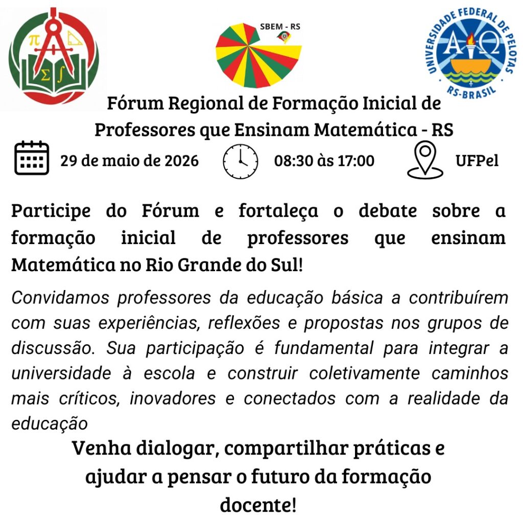 A Universidade Federal de Pelotas (UFPel) receberá, no dia 29 de maio de 2026, o Fórum Regional de Formação Inicial de Professores que Ensinam Matemática – RS.