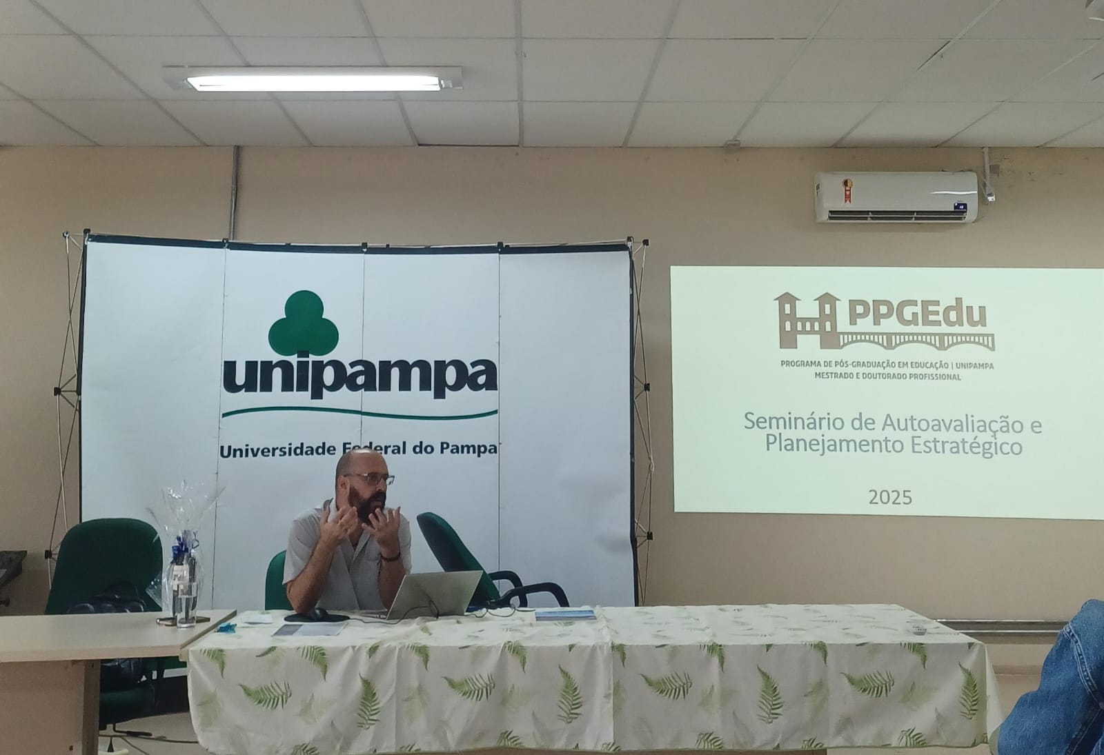 Nos dias 08 e 09 de dezembro de 2025, ocorreu o SEMINÁRIO DE PLANEJAMENTO ESTRATÉGICO E AUTOAVALIAÇÃO DO PPGEdu, no auditório da Unipampa Campus Jaguarão. O objetivo do evento foi mobilizar a reflexão coletiva sobre as ações realizadas no programa, bem como retomar suas metas e iniciativas. Para aprimorar o trabalho coletivo acerca da avaliação do programa, no dia 08/12, foram promovidas rodas de conversa sobre o sistema de avaliação da pós-graduação no país com os palestrantes, os doutores Thiago Ingrassia Pereira (UFFS) e Rafael Fonseca de Castro (UNIR). No dia 09 de dezembro, a Prof.ª Dr.ª Ana Cristina da Silva Rodrigues apresentou os dados de uma avaliação do PPGEdu feita por discentes, egressos, docentes e comunidade externa. Além disso, a Prof. Dr.ª Juliana Brandão Machado apresentou o Planejamento Estratégico de 2025 e, após, foram realizadas discussões em duplas sobre os objetivos, metas e iniciativas para o ano de 2026, 2027 e 2028.