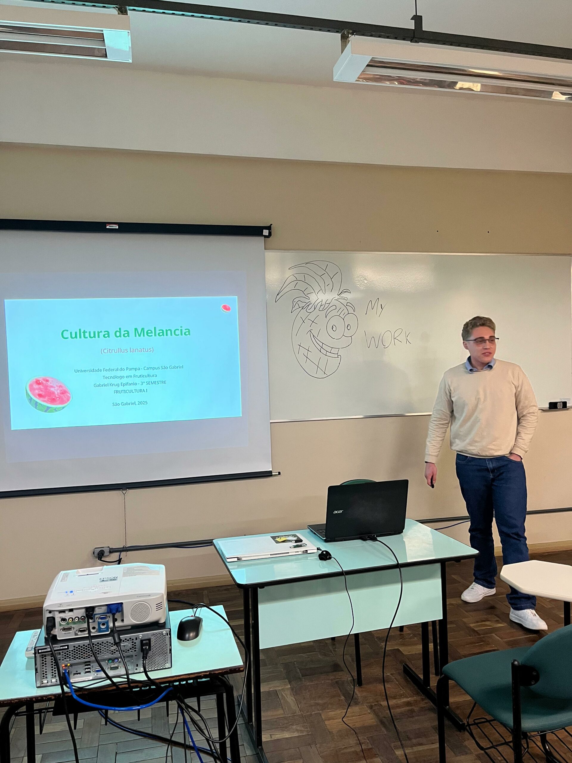 Na manhã de terça-feira, 30 de setembro de 2025, os alunos dos cursos de Tecnologia em Fruticultura e Gestão Ambiental da Unipampa – Campus São Gabriel, acompanhados pelas professoras Cássia Regina Nespolo, docente das disciplinas Ciência de Alimentos e Tecnologia do Processamento de Frutas, e Andressa Rocha Lhamby, docente das disciplinas Sustentabilidade Empresarial e Mercado Verde, realizaram uma visita às dependências da empresa Gorange Cultivo, Comércio, Importação e Exportação de Frutas Ltda., localizada na Fazenda Santa Eulália, interior do município de Santa Margarida do Sul.