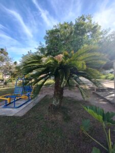 It is a dioecious, evergreen tree that can reach up to 3 meters in height and grows very slowly. Its trunk is cylindrical and robust with a fibrous appearance. Its leaves are pinnate (feather-shaped), measuring from 90 cm to 2 meters in length, with narrow, numerous, leathery leaflets with spiny tips. As it is a gymnosperm, it does not have flowers, but conical male reproductive structures and female reproductive structures in the form of carpophylls (leaves with seeds). Male plants produce voluminous, scaly, brown conical structures, while female plants have structures around the crown in the form of thick, yellowish, velvety blades with cutouts at the edges, in which naked ovules are inserted.