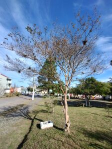 The Crab tree is an exotic species, also known as Reseda, Julieta, Escumilha, Minerva-dos-jardins, or Flor-de-são-sebastião. It belongs to the Lythraceae family, and its scientific name is Lagerstroemia indica L. Etymologically, the word “Lagerstroemia” pays homage to Magnus von Lagerström, a Swedish merchant and friend of Carl Linnaeus, the father of modern taxonomy and descriptor of the species. And “indica” corresponds to its geographical origin, which is Asia and Oceania.